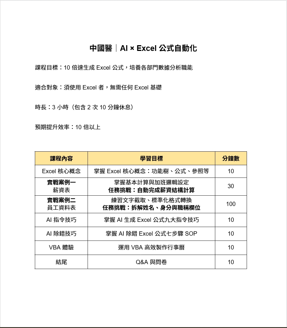 ● 活動內容: ✨Excel 核心概念 : 掌握Excel 核心概念:功能樹、公式、參照等 ✨實戰案例一 -薪資表 : 掌握基本計算與加班邏輯設定 任務挑戰:自動完成薪資結構計算 ✨實戰案例二 -員工資料表 : 練習文字截取、標準化格式轉換 任務挑戰:拆解姓名、身分與職稱欄位 ✨AI 指令技巧 : 掌握AI生成 Excel 公式九大指令技巧 ✨AI除錯技巧 : 掌握AI除錯 Excel 公式七步驟SOP ✨VBA 體驗 : 運用VBA高效製作行事曆 ✨結尾 : Q&A與問卷