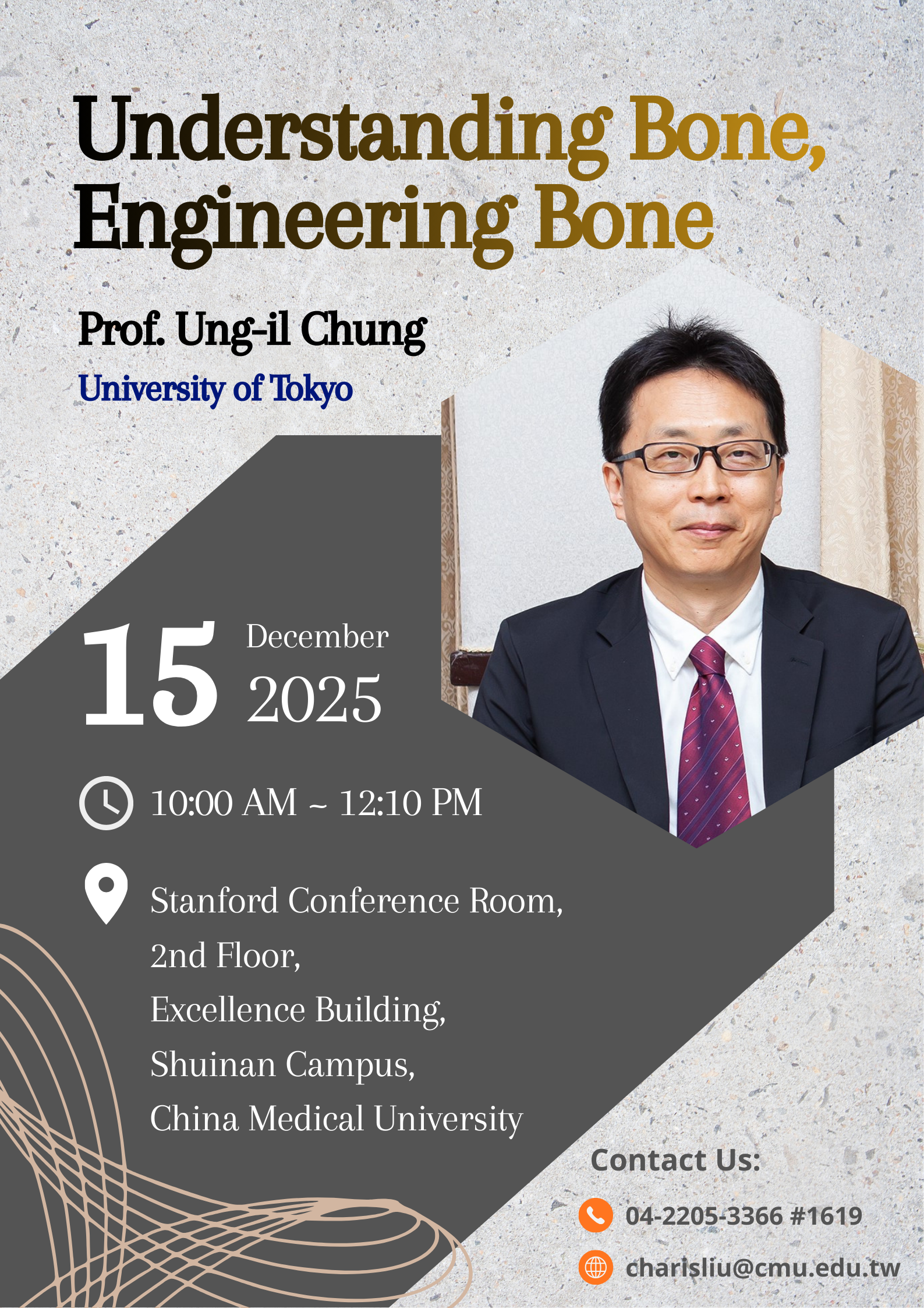 | 活動內容: | 本次講座榮幸邀請東京大學鄭雄一教授(Prof. Ung-il Chung)蒞臨演講,主題為「Understanding Bone, Engineering Bone」。鄭教授將深入探討骨骼科學的基礎理論與臨床應用,從骨骼的結構組成、生長機制、修復過程等基礎知識出發,說明骨細胞的功能運作及骨骼相關疾病的病理機轉。演講後半部將聚焦於骨組織工程領域的最新研究進展,包括如何運用生物材料、幹細胞技術、3D生物列印等創新技術進行骨再生治療,以及骨缺損修復的臨床應用策略。本講座將完整呈現從基礎研究到臨床轉譯的科學歷程,適合對再生醫學、骨科學、生物醫學工程及轉譯醫學有興趣的教師與學生參加,歡迎踴躍報名參與這場精彩的學術交流。 |