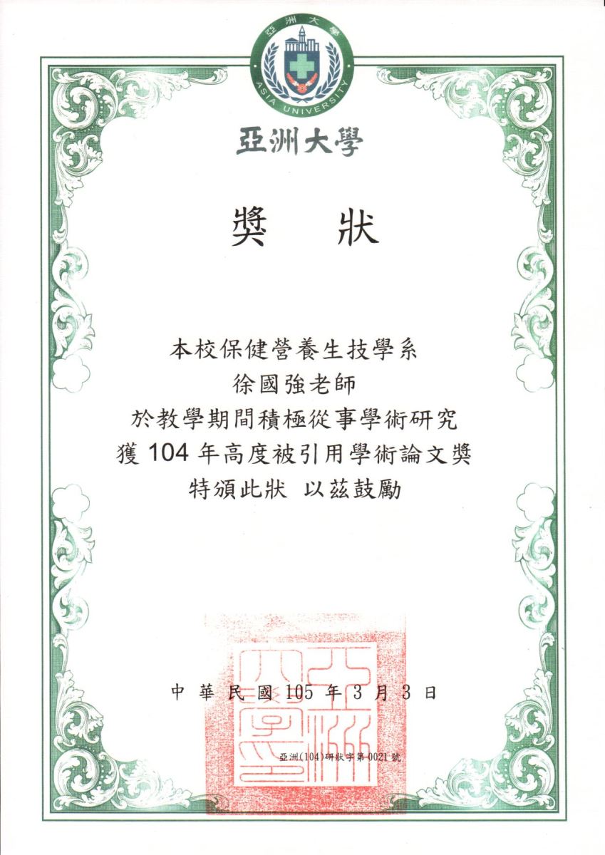 - 亞洲大學高引用論文獎