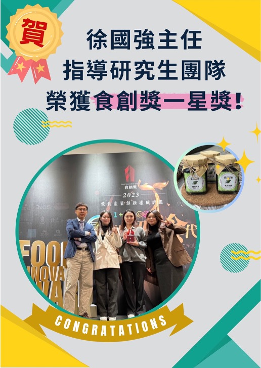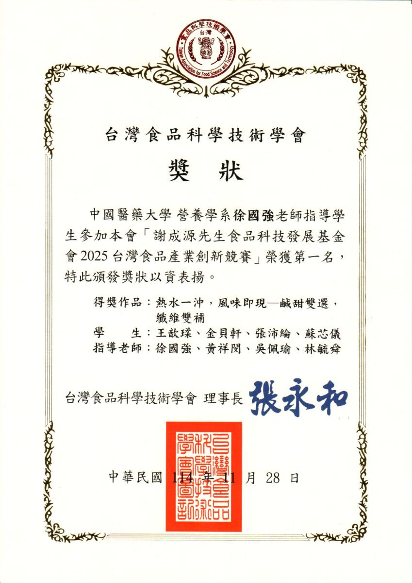 - 台灣食品科學技術學會謝成源先生食品科技發展基金會2025台灣食品產業創新競賽第一名「熱水一沖,風味即現--鹹甜雙選,纖維雙補」--王歆?、金貝軒、張沛綸、蘇芯儀,指導老師:徐國強、黃祥閔、吳佩瑜、林毓舜