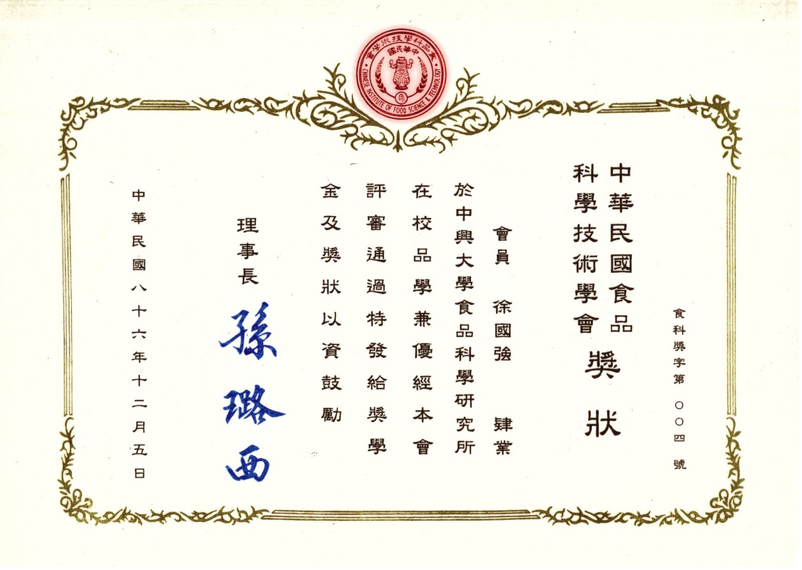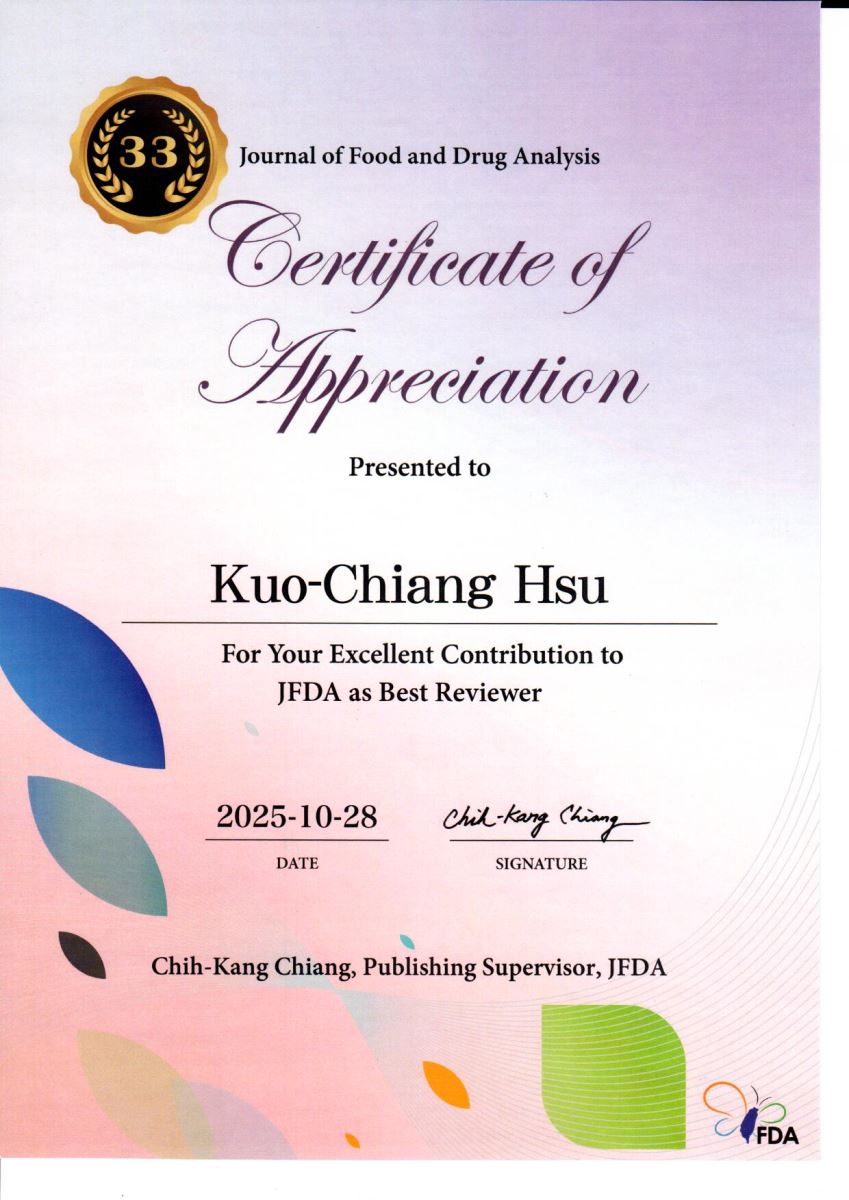 - 台灣食品科學技術學會學術研究榮譽獎