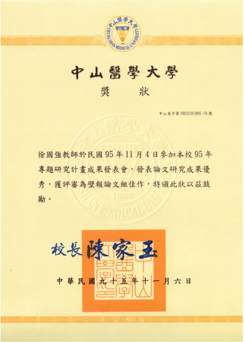 中山醫學大學95年專題研究計畫成果發表會壁報論文組佳作