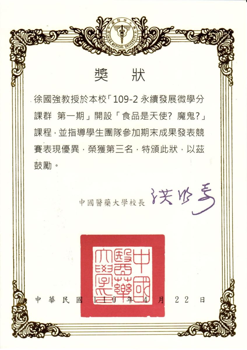- 中華民國食品科學技術學會論文競賽優勝