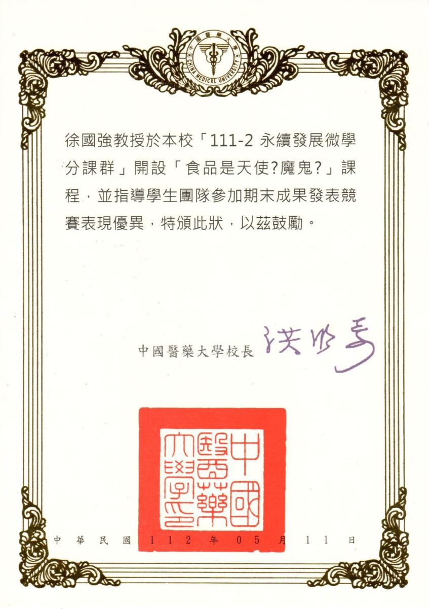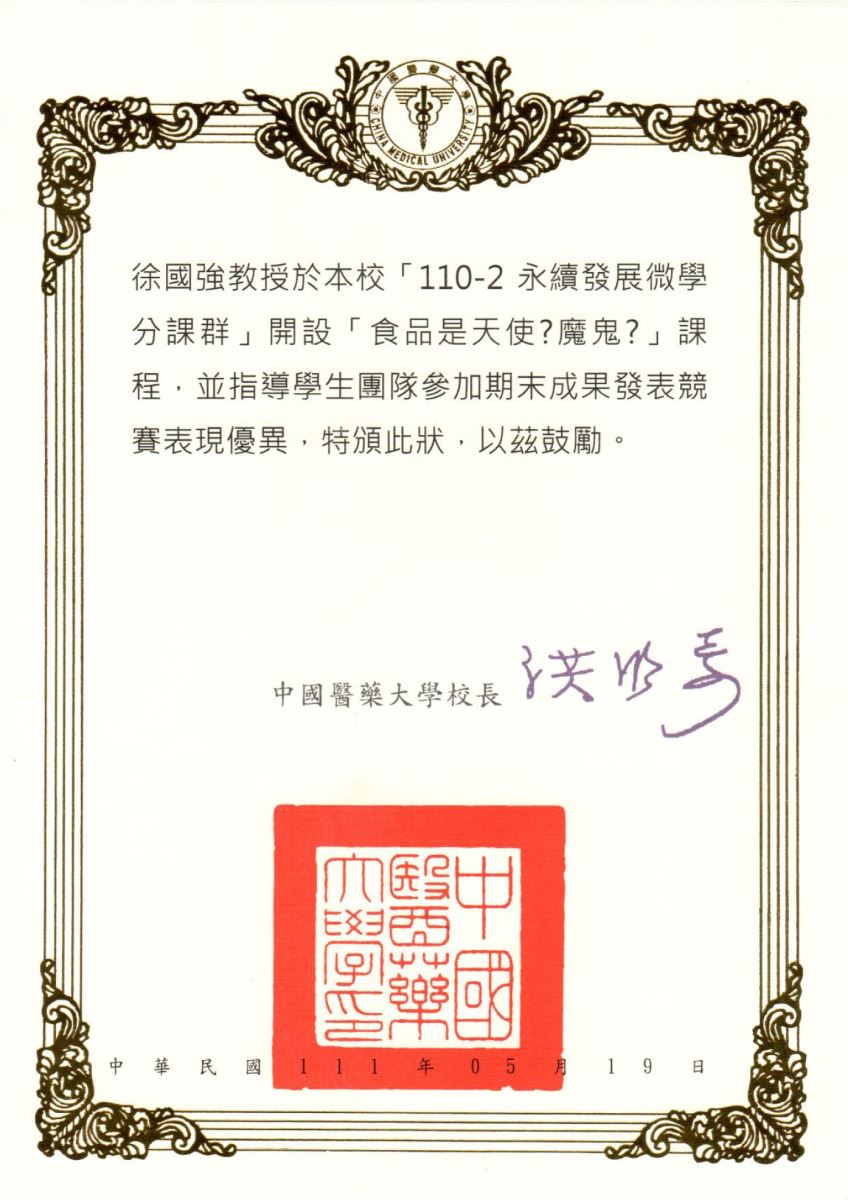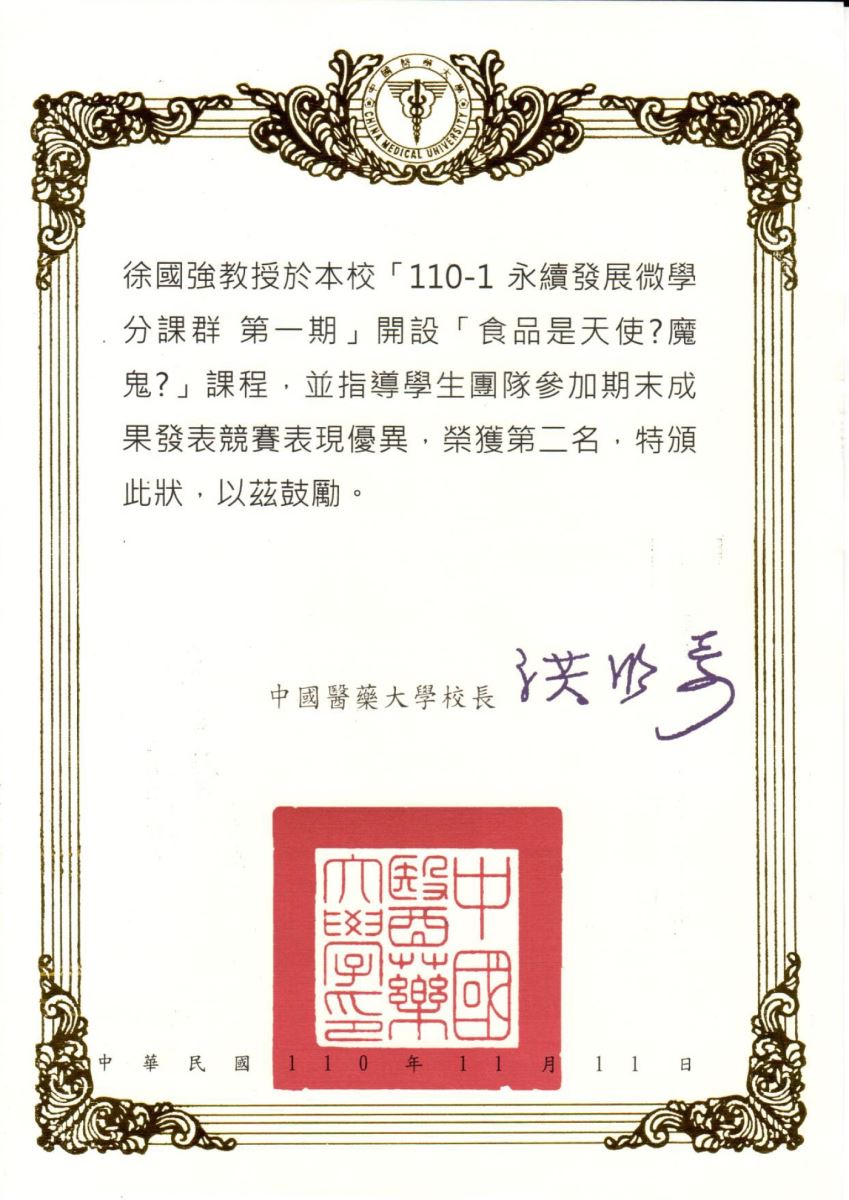 - 中國醫藥大學永續發展微學分課群期末成果發表競賽第三名