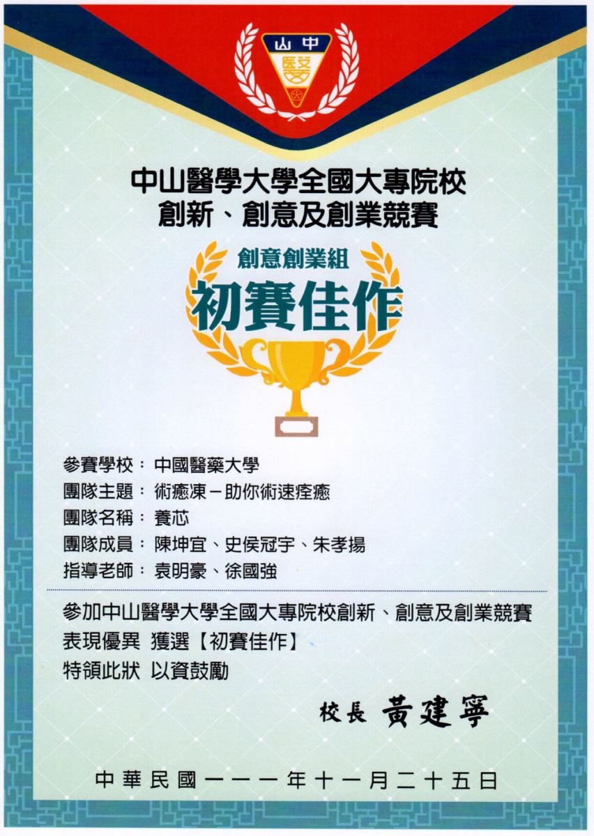 - 全國大專院校創新、創意及創業競賽創意創業組初賽佳作「養芯」--陳坤宜、史侯冠宇、朱孝揚,指導老師:袁明豪、徐國強