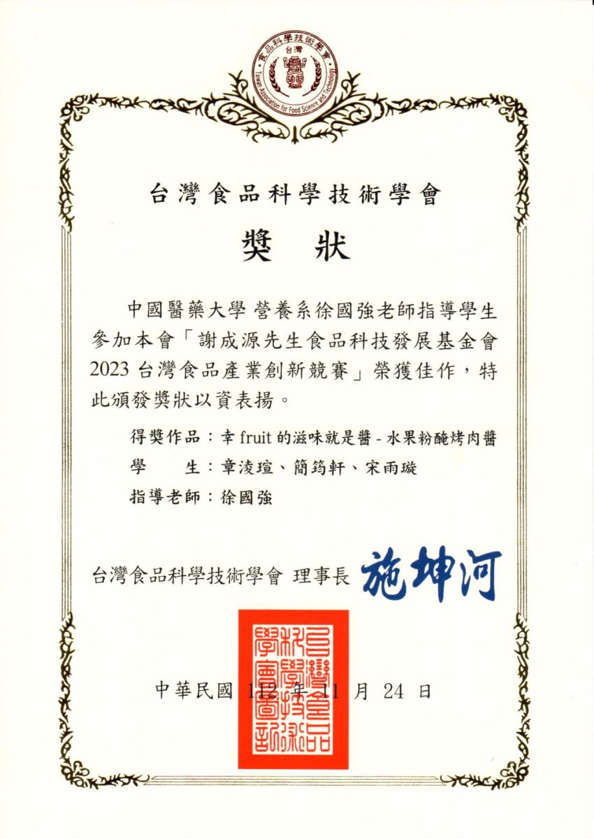 - 台灣食品科學技術學會謝成源先生食品科技發展基金會2023台灣食品產業創新競賽佳作「幸fruit的滋味就是醬-水果粉醃烤肉醬」--章淩瑄、簡筠軒、宋雨璇,指導老師:徐國強