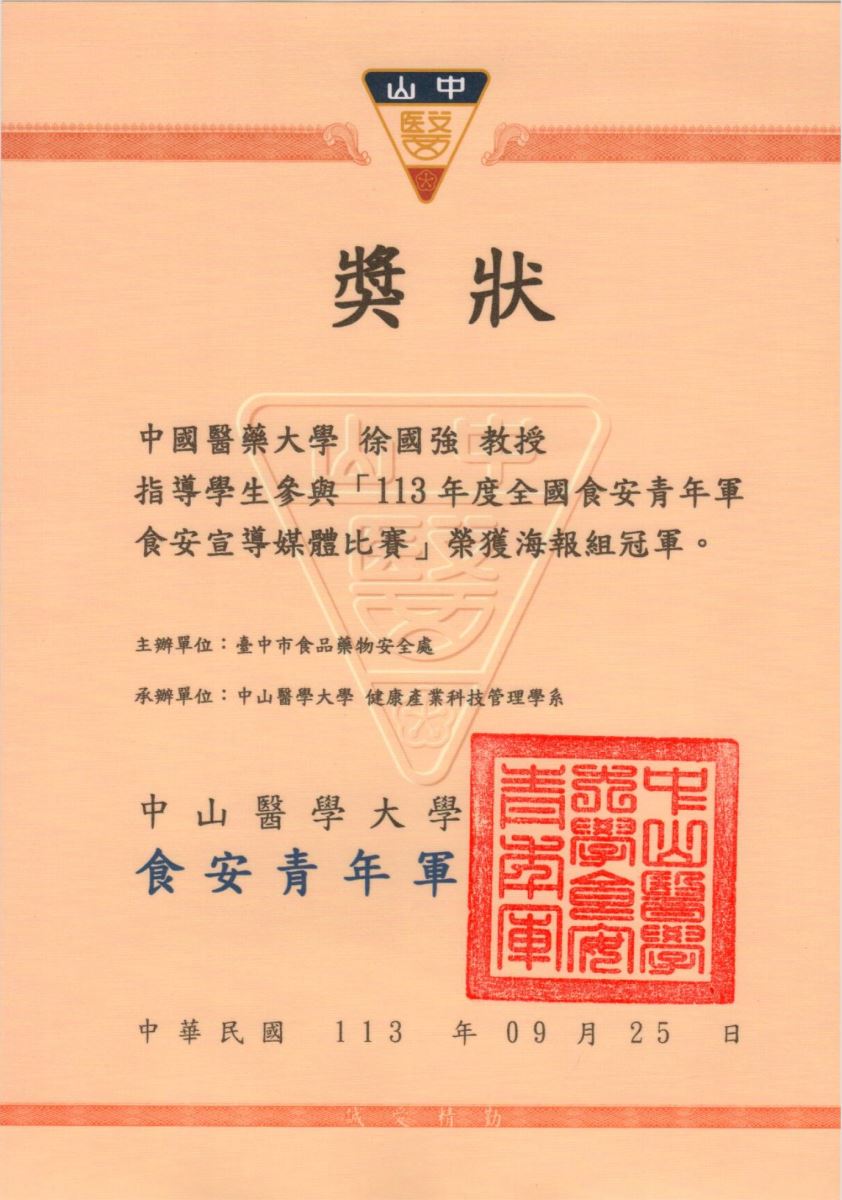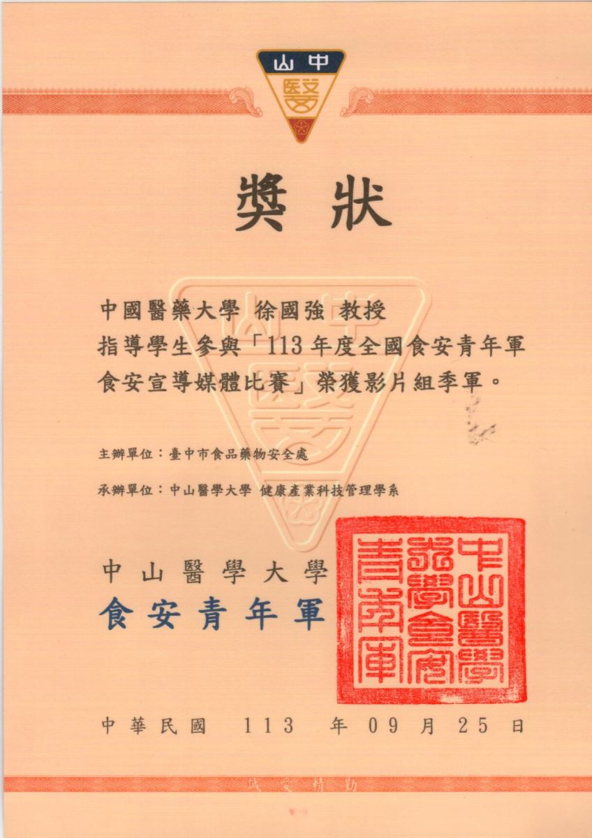 - 「113年度全國食安青年軍食安宣導媒體比賽」影片組季軍--味精知多少--鍾詠卉、管世恩、黃淨微、章淩瑄、簡筠軒,指導老師:徐國強