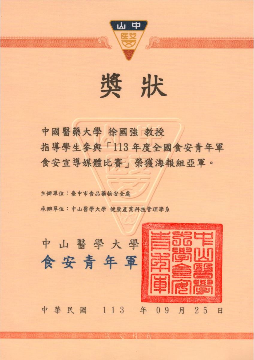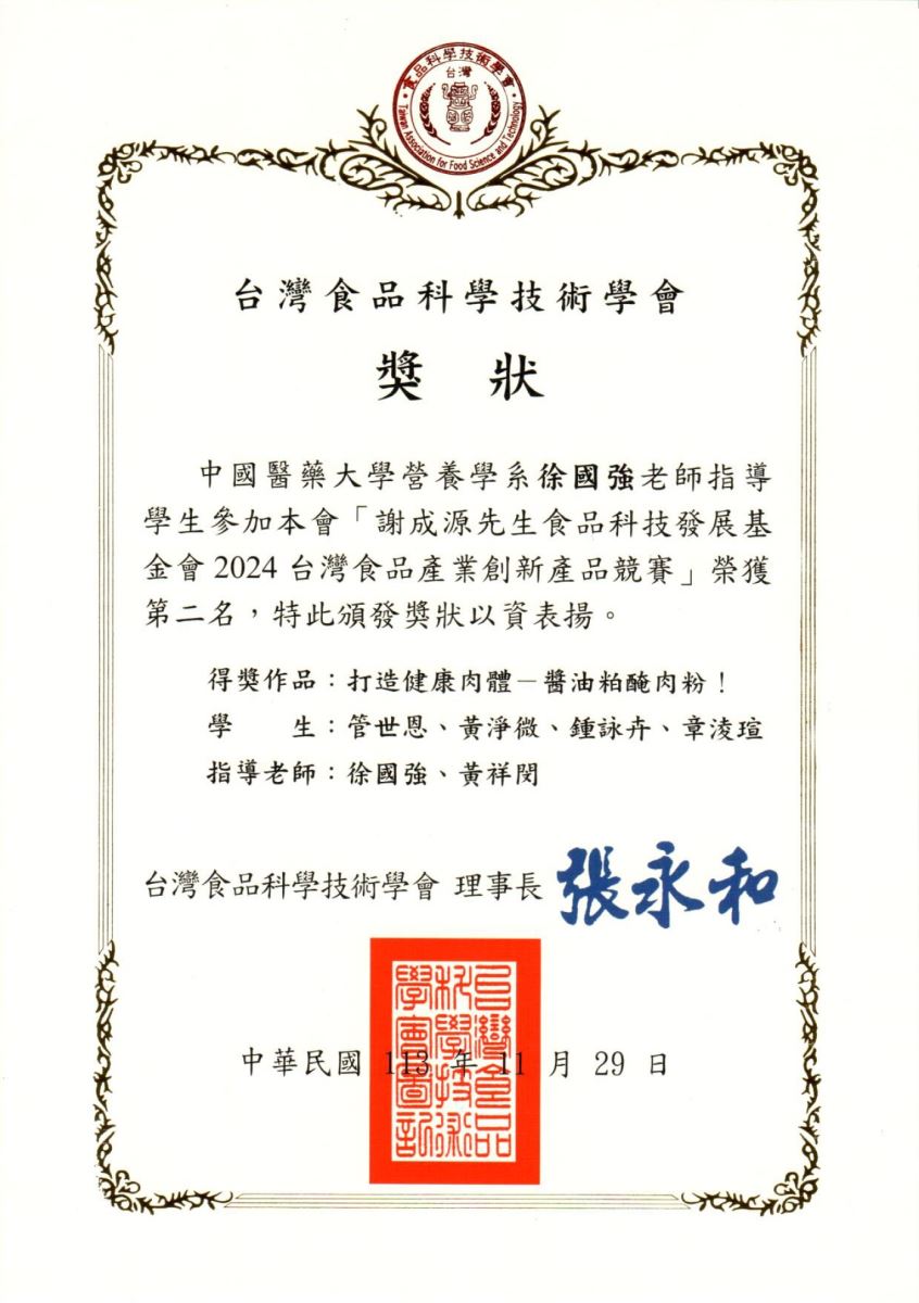 - 台灣食品科學技術學會謝成源先生食品科技發展基金會2024台灣食品產業創新競賽第二名「打造健康肉體-醬油粕醃肉粉」--管世恩、黃淨微、鍾詠卉、章淩瑄,指導老師:徐國強、黃祥閔