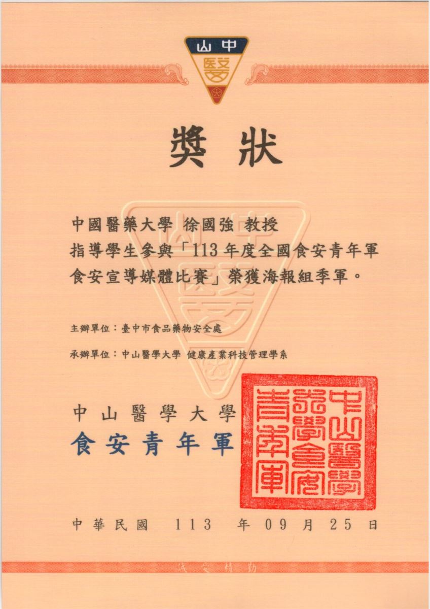 - 「113年度全國食安青年軍食安宣導媒體比賽」海報組冠軍--這樣吃真的「黴」問題嗎--鍾詠卉,指導老師:徐國強、林毓舜