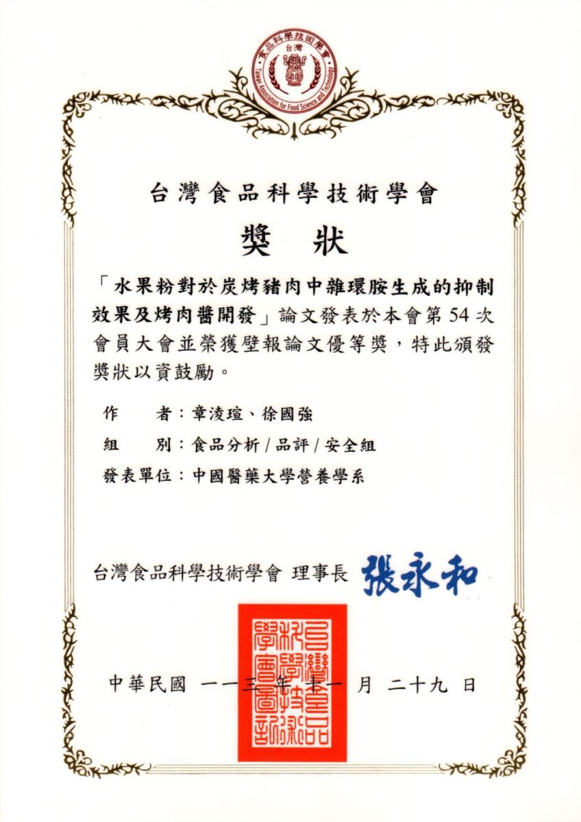 - 台灣食品科學技術學會第54次會員大會壁報論文優等獎「水果粉對於炭烤豬肉中雜環胺生成的抑制效果及烤肉醬開發」--章淩瑄、徐國強