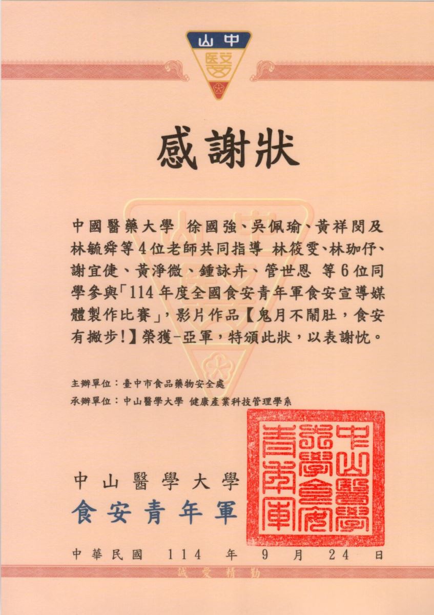 - 114年度全國食安青年軍「節慶好食光,食安靠你扛!」宣導影片比賽第二名--鬼月不鬧肚,食安有撇步!--林筱雯、林珈?、謝宜倢、黃淨微、鍾詠卉、管世恩,指導老師:徐國強、吳佩瑜、黃祥閔、林毓舜
