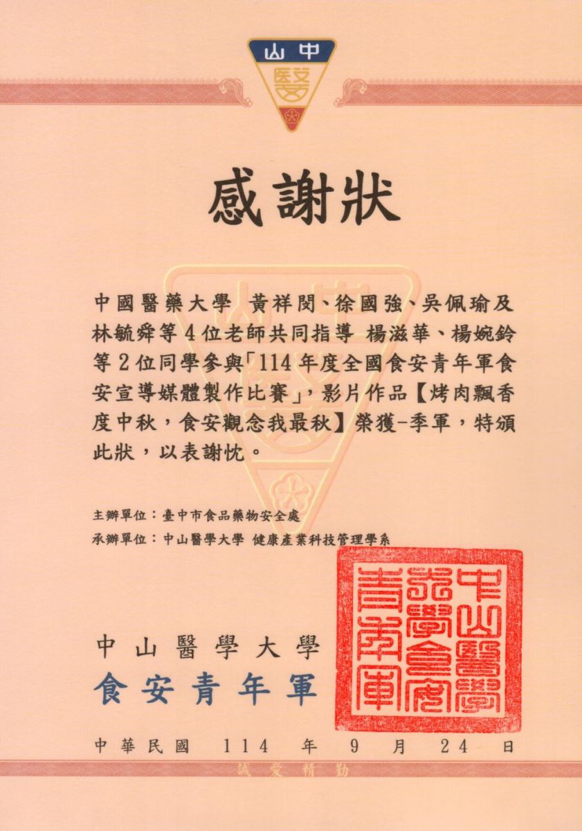 - 114年度全國食安青年軍「節慶好食光,食安靠你扛!」宣導影片比賽第三名--烤肉飄香度中秋,食安觀念我最秋--楊滋華、楊婉鈴,指導老師:黃祥閔、徐國強、吳佩瑜、林毓舜