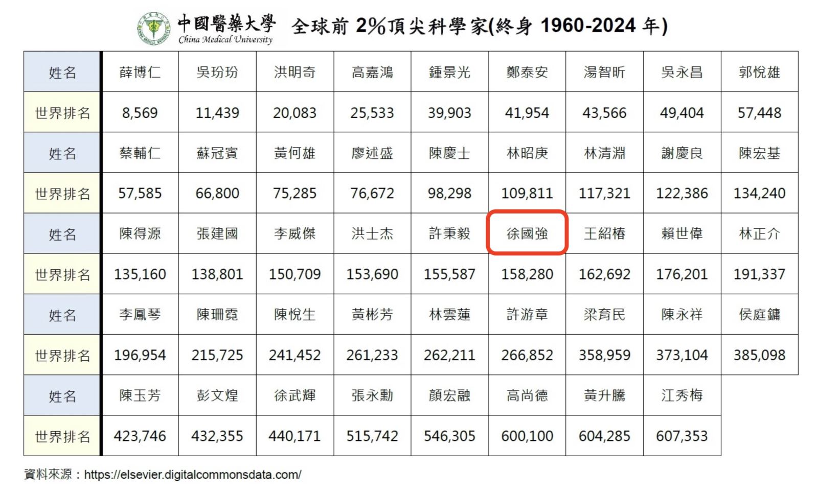 - 1960-2022年入選全球前2%頂尖科學家終身排行榜