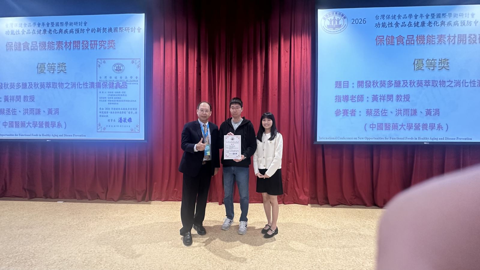實驗室榮獲2026台灣保健食品學會年會暨國際學術研討會:功能性食品在健康老化與疾病預防中的新契機之「保健食品機能素材開發研究獎」優等獎(獎金3萬元)